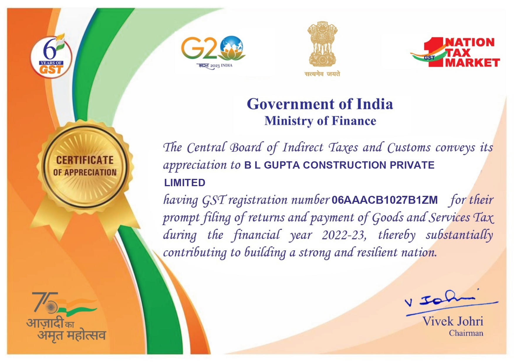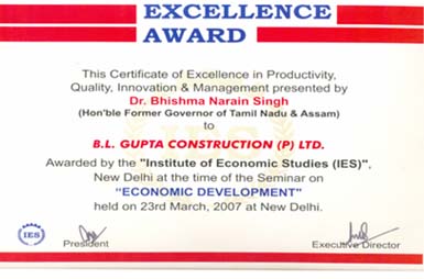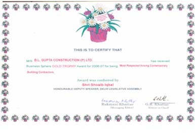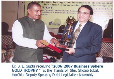 Our managing director, Er. B.L. gupta has been awarded 2006-2007 gold trophy by the business sphere group for his contribution and excellence in the construction industry and a profile of the company published in the january, 2007 issue of business sphere magzine.
