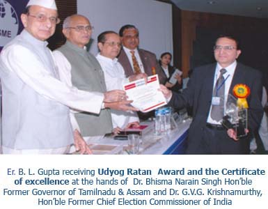 Likewise Mr. B. L. Gupta has been presented“UDYOG RATAN AWARD”and the company a certificate of excellence in Productivity, Quality, Innovation and Management by the Institute of Economic Studies, New Delhi in March, 2007